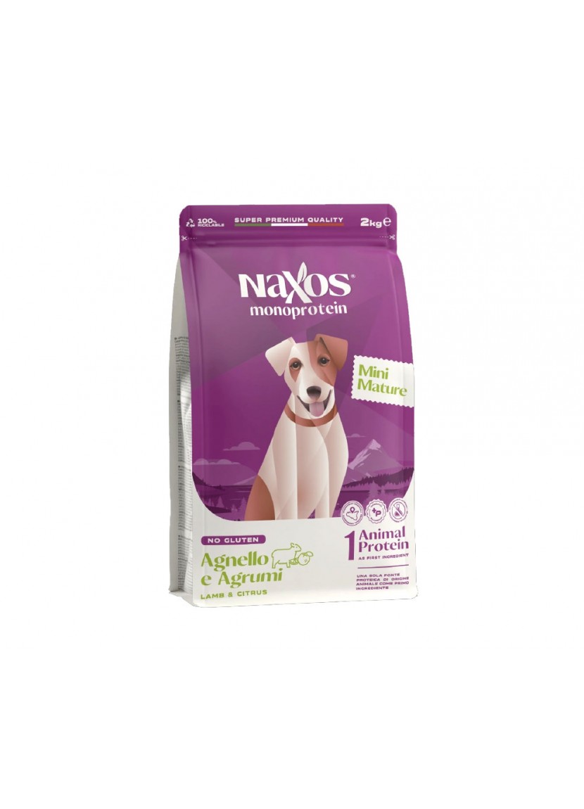 Η Naxos Mini Mature Lamb and Citrus είναι μια τροφή που συνιστάται για μικρόσωμους (από 1kg-10kg) ηλικιωμένους σκύλους (8 ετών και άνω) με υψηλή θρεπτική αξία και ένα μείγμα βιταμινών και μετάλλων. Η προσθήκη χονδροϊτίνης και γλυκοζαμίνης ενισχύει τους χόνδρους και ενισχύει την υγεία των αρθρώσεων. Στη συνταγή μας, χρησιμοποιούμε μία μόνο πηγή πρωτεΐνης , Αρνίσιο κρέας, ιταλικής προέλευσης, δημητριακά χωρίς γλουτένη και δεν χρησιμοποιούμε σόγια, καλαμπόκι ή πρόσθετα τεχνητά συντηρητικά.