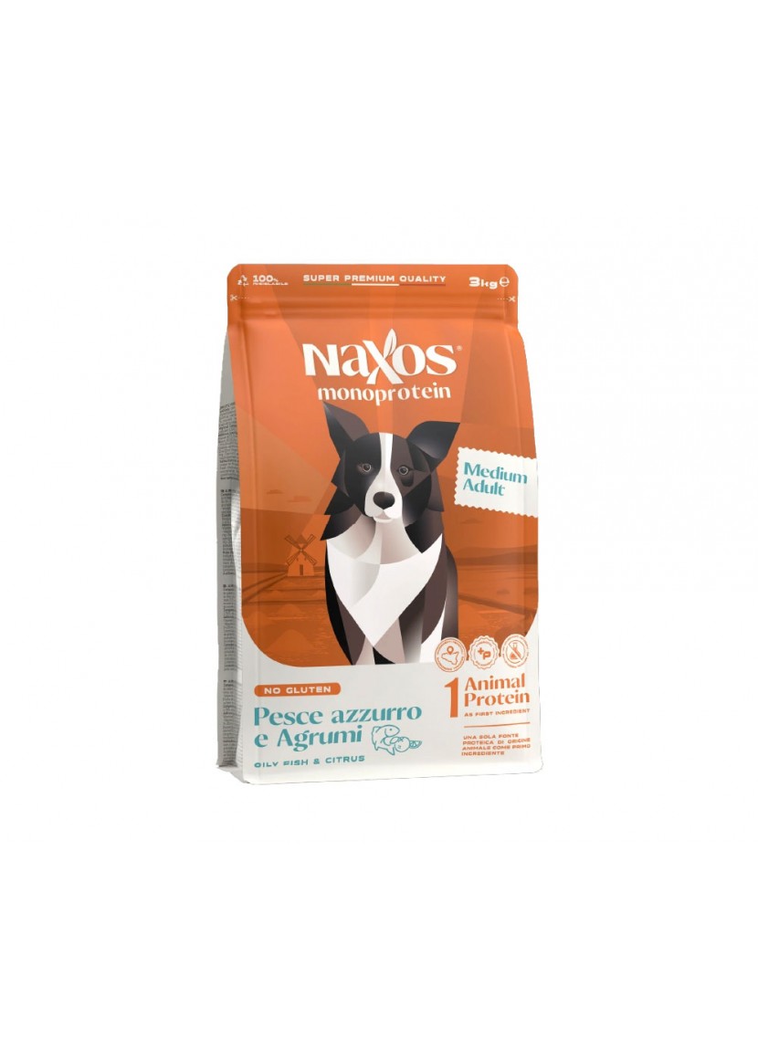 H Naxos Adult Medium – Blue fish and citrus είναι η συνιστώμενη τροφή συντήρησης για ενήλικους σκύλους μεσαίου μεγέθους. Η μονοπρωτεΐνη Naxos είναι μια πλήρης και ισορροπημένη τροφή που παρασκευάζεται με μια αφυδατωμένη πηγή ζωικής πρωτεΐνης, Ολόκληρα Ψάρια ιταλικής προέλευσης. Στη συνταγή μας, χρησιμοποιούμε μόνο δημητριακά χωρίς γλουτένη και χωρίς σόγια, καλαμπόκι ή πρόσθετα τεχνητά συντηρητικά.